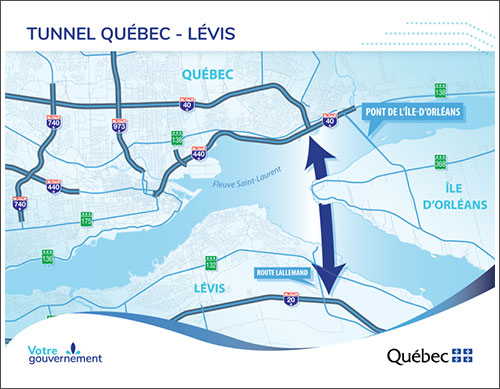 Concrètement, le tracé présentement privilégié permettrait de relier directement par un tunnel l’autoroute 20 sur la Rive-Sud, dans le secteur de la route Lallemand à Lauzon, au prolongement de l’autoroute 40 sur la Rive-Nord, dans le secteur Beauport.